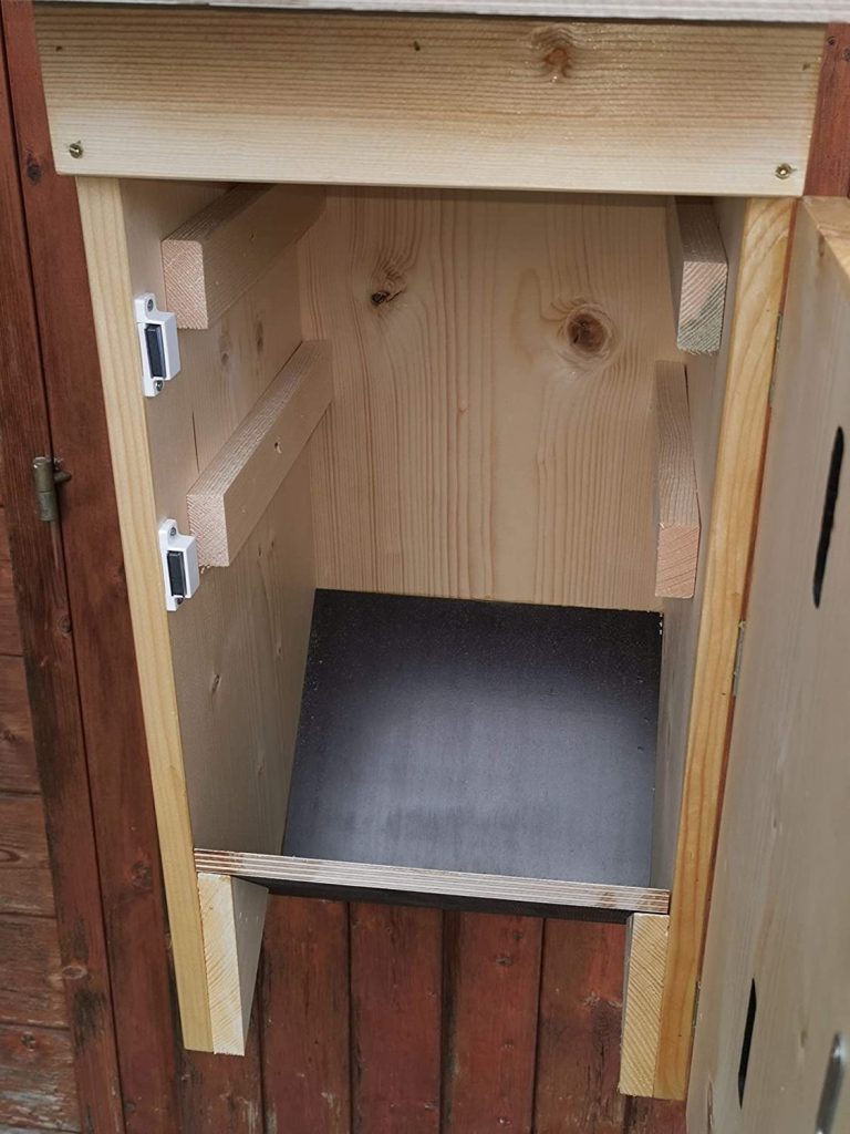 – Am Boden sorgen 2 glatte, wasserbeständige schräg nach unten zueinander verbauten Brettern dafür, dass der Abfall und Kot der Hornissen aus dem Kasten fallen kann. Der Spalt ist nicht so gross, dass ein Vogel ins Innere des Kastens gelangen kann.